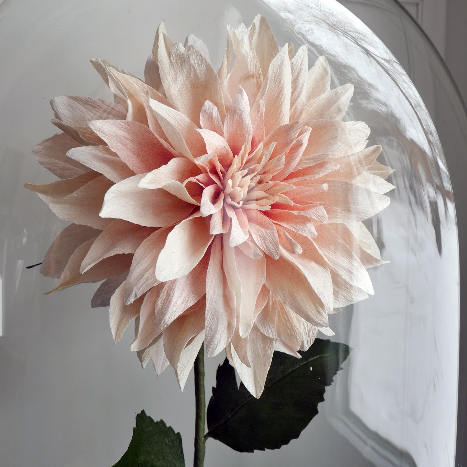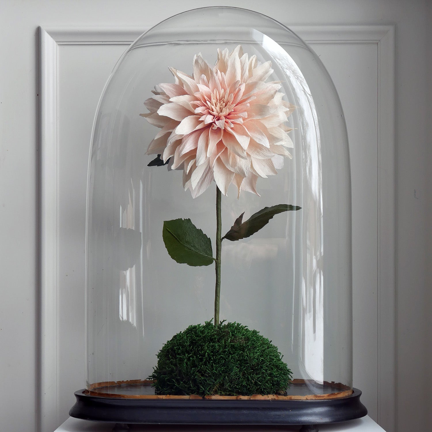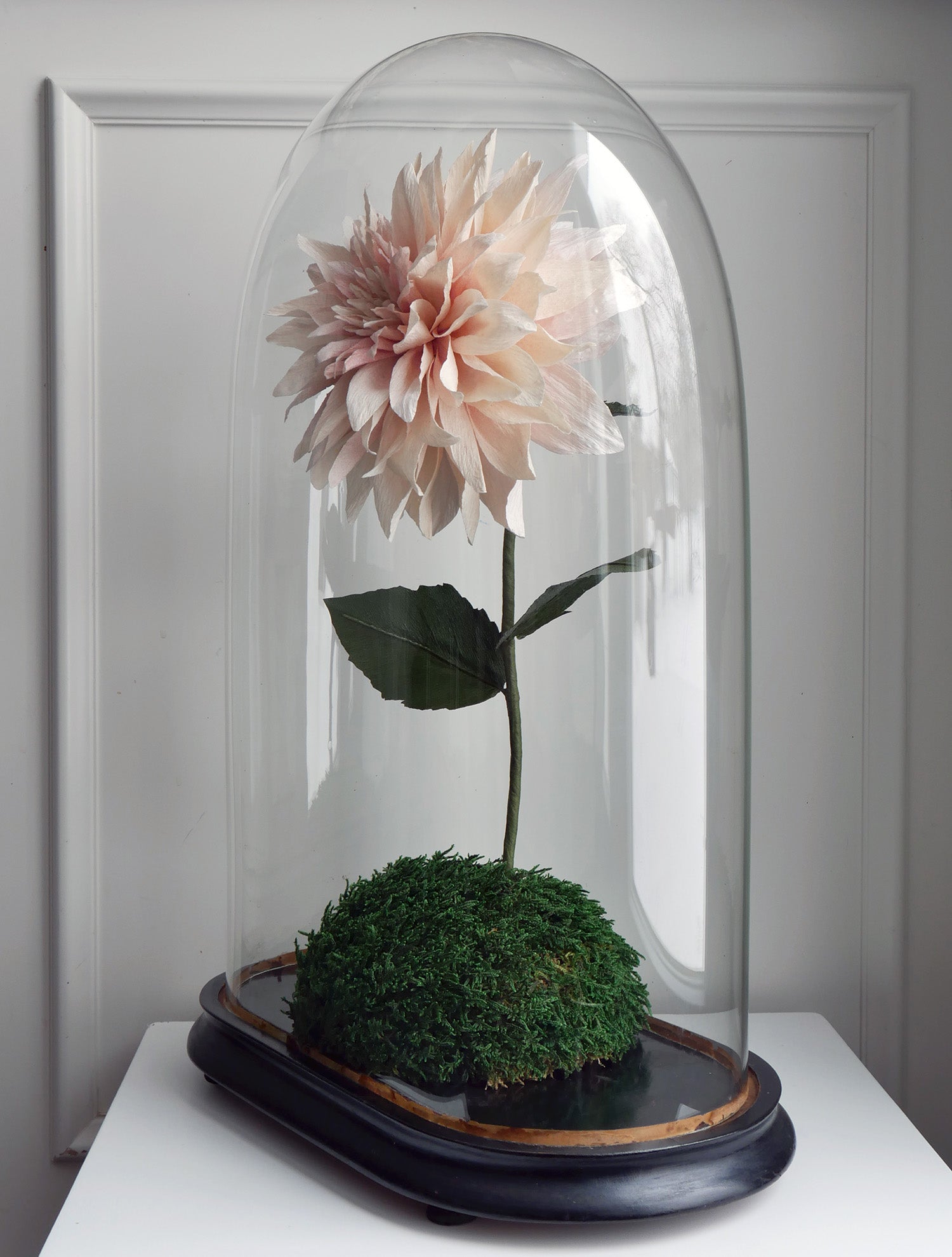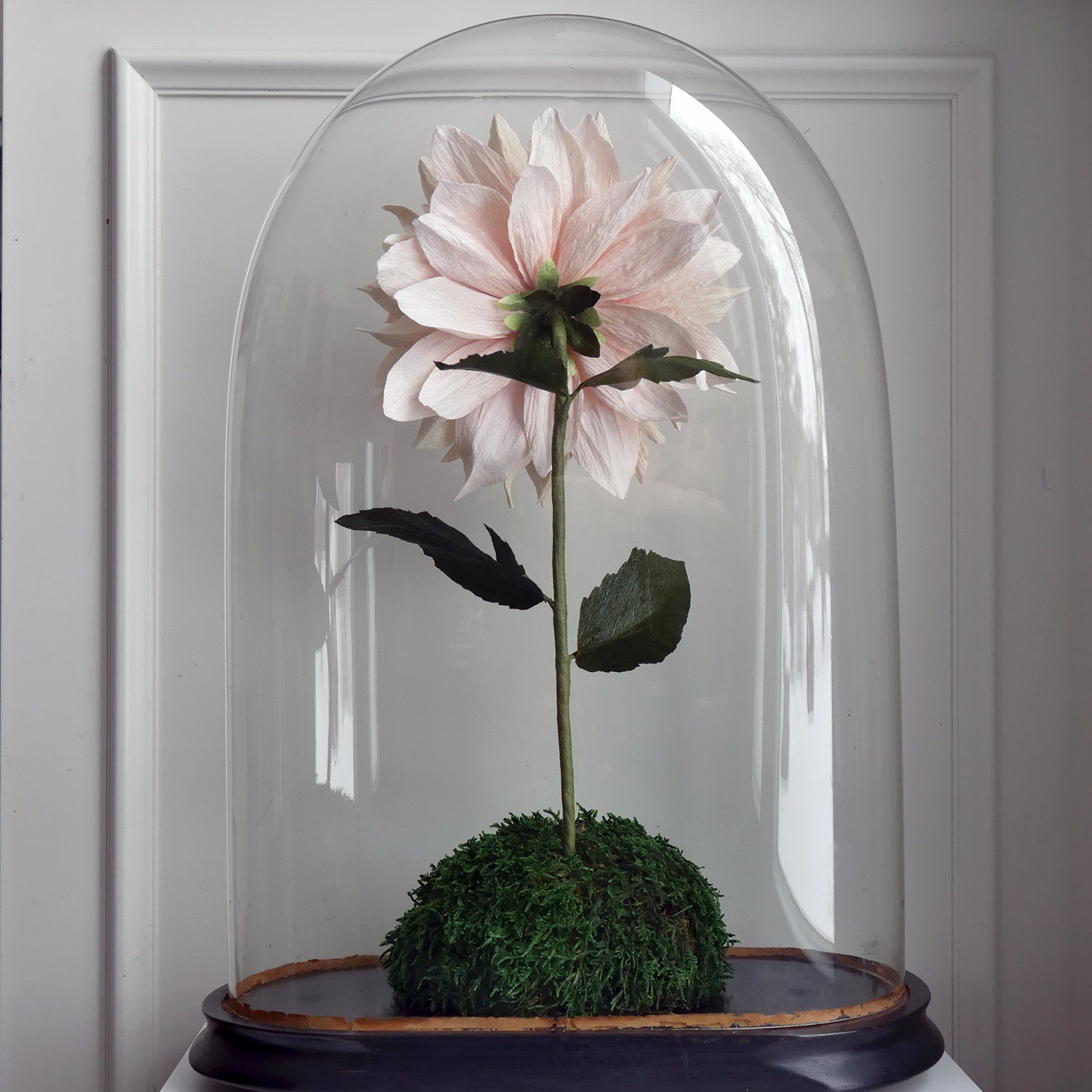 This beautiful recreation of the flower involves careful dying and shaping of the paper petals to create the signature layered look of this bloom. The flower will be shipped with a 8" glass bud vase (glass dome not for sale).