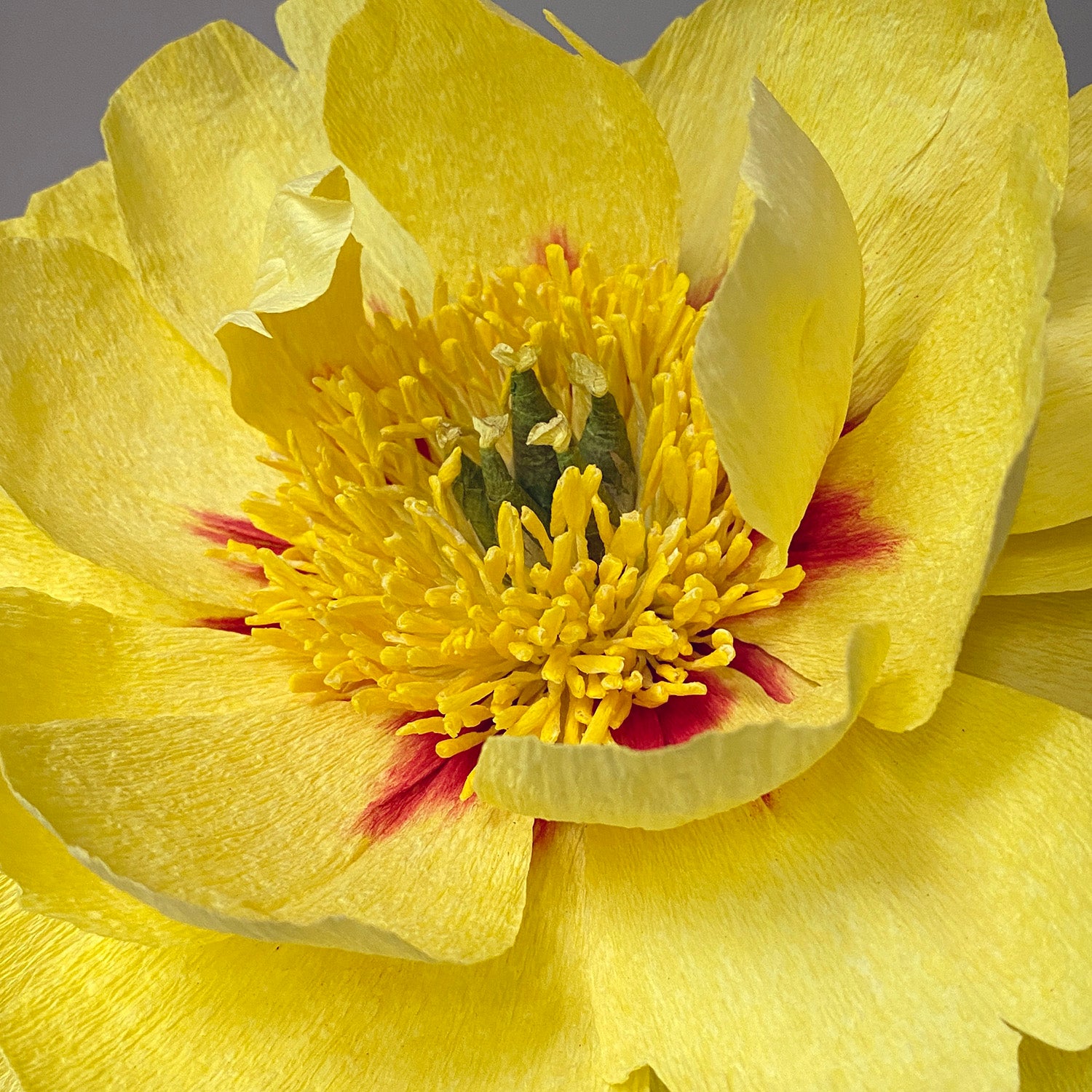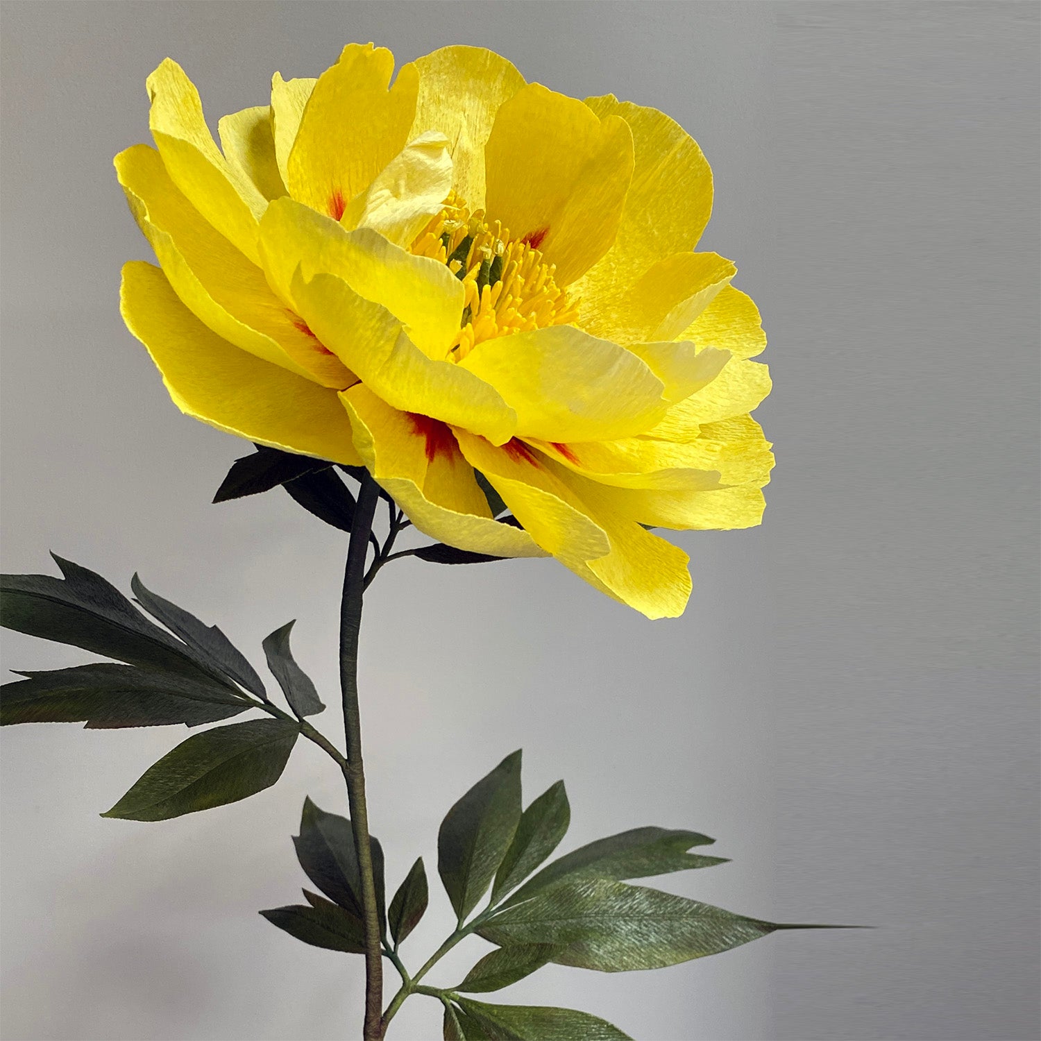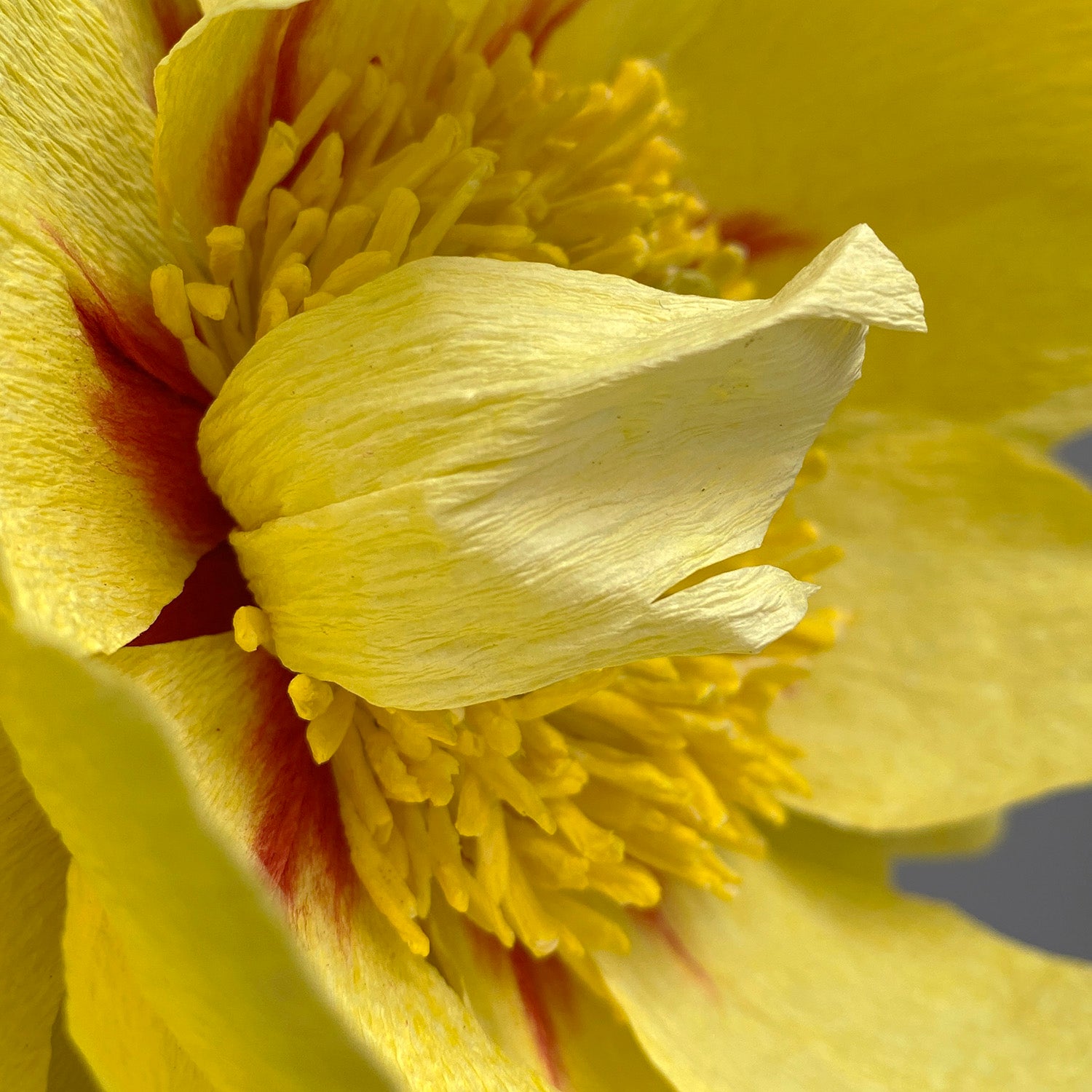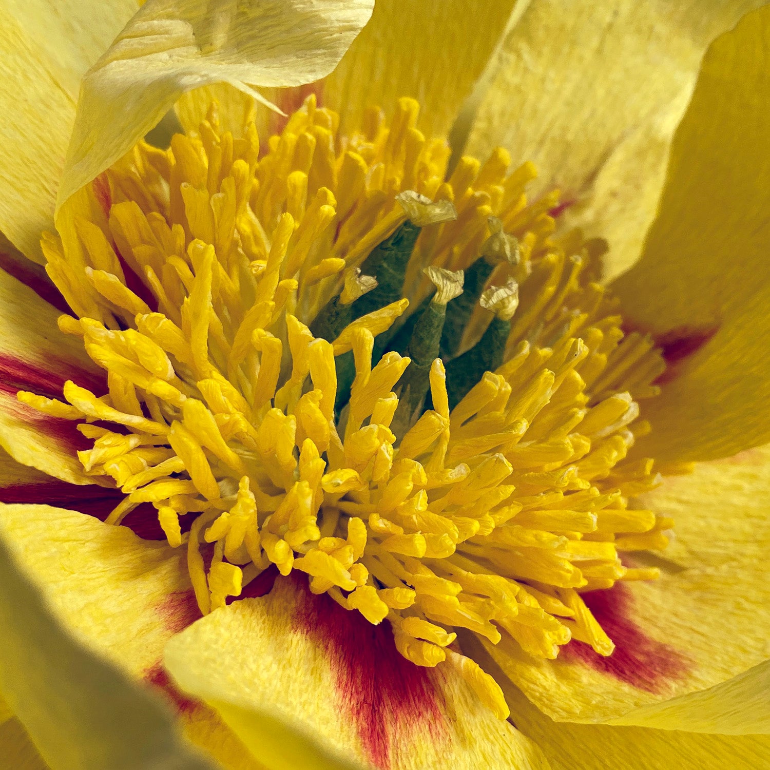 Bartzella Itoh bóndinn er sannarlega sólskin í blóma. Ofstór blóm hennar eru merkt með rauðlituðum krónublöðum í átt að miðju þeirra. Það sem dró mig að þessu blómi er stærð þess og vástuðull. Það er sannarlega smá hamingja sem birtist í eigin vasi (ekki innifalinn).