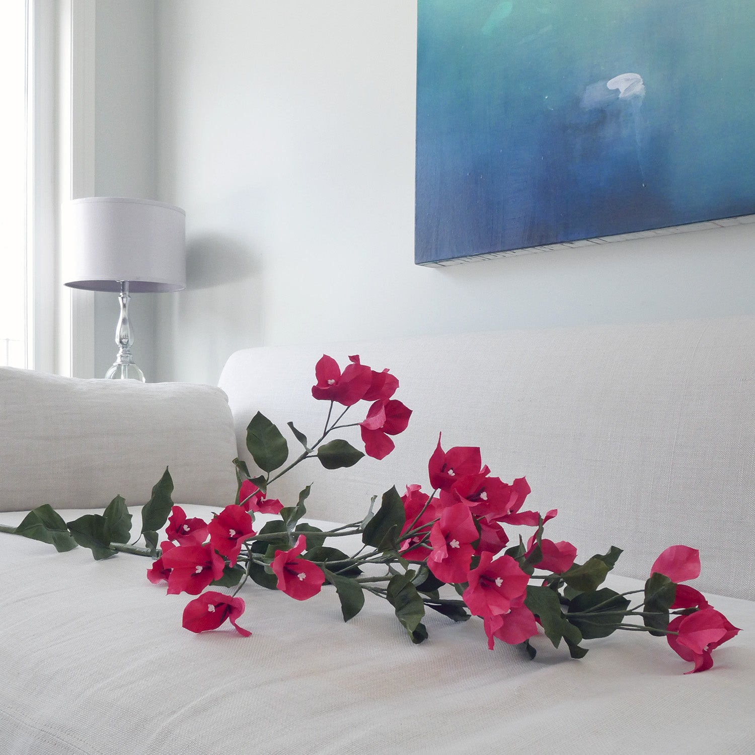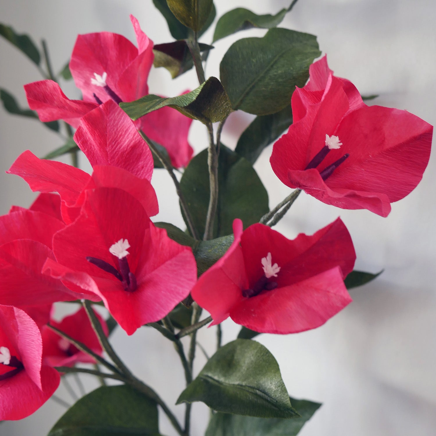 The Bougainvillea branch is handcrafted from German doublette crepe paper and coloured with various techniques to achieve lifelike qualities.