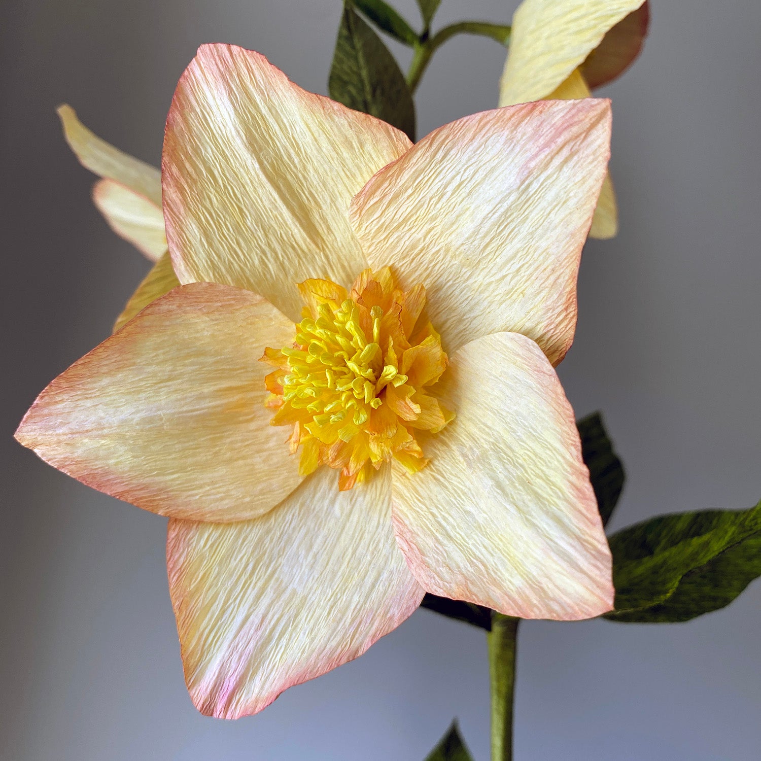 A beautiful and sculpted version of the Daybreak Hellebore from crepe paper. This flower glows spring with its sunrise tones of yellows, oranges and pinks. The nodding blooms of the Hellebore are demure and pretty and well displayed in a tall bud vase.