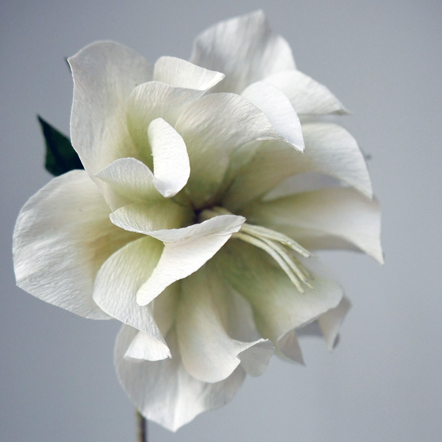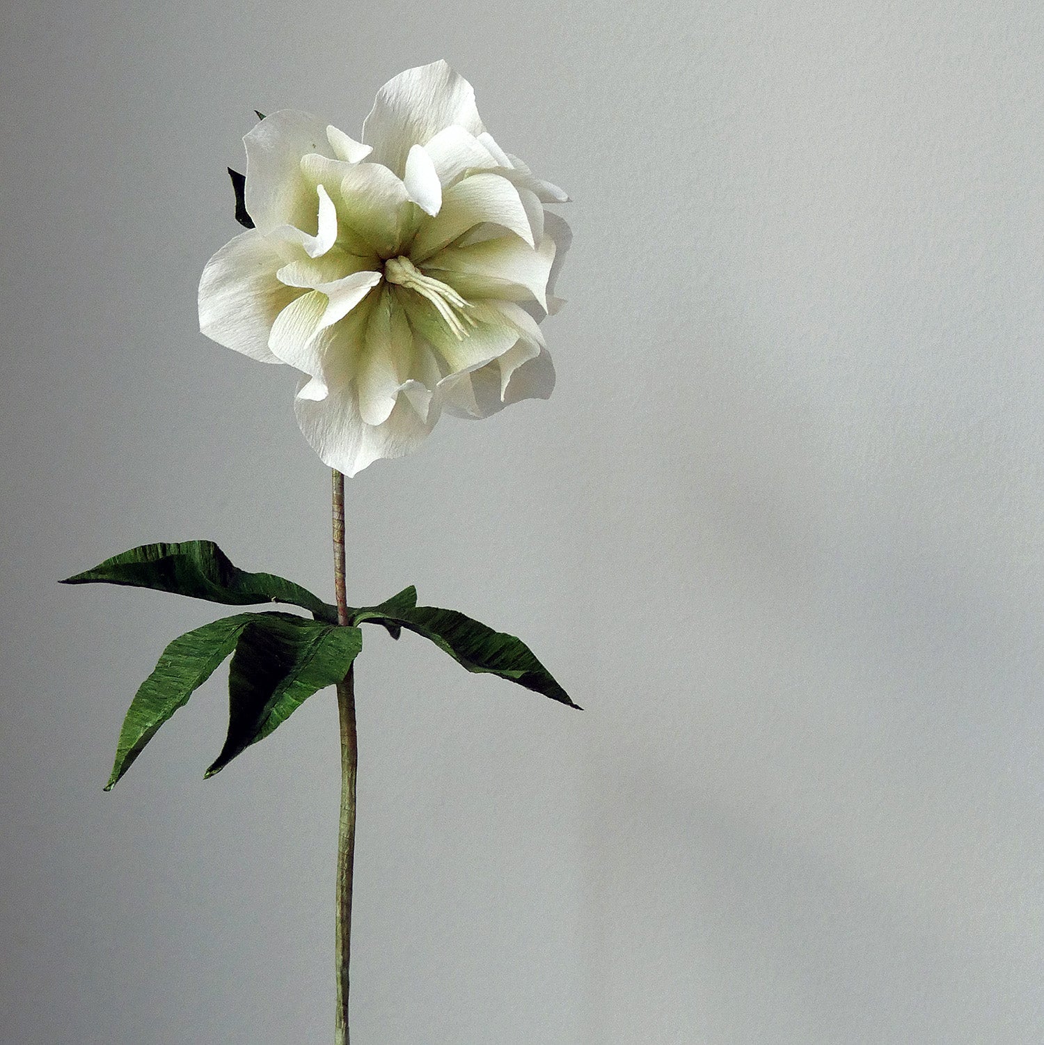 A beautiful and sculpted version of the double Helleborus Orientalis from crepe paper. I was captivated by this flower's ruffled petals that curl in towards a center of finger like stamen. The resulting creation in paper has an elegant and simple form that allows this stem to shine on its own.