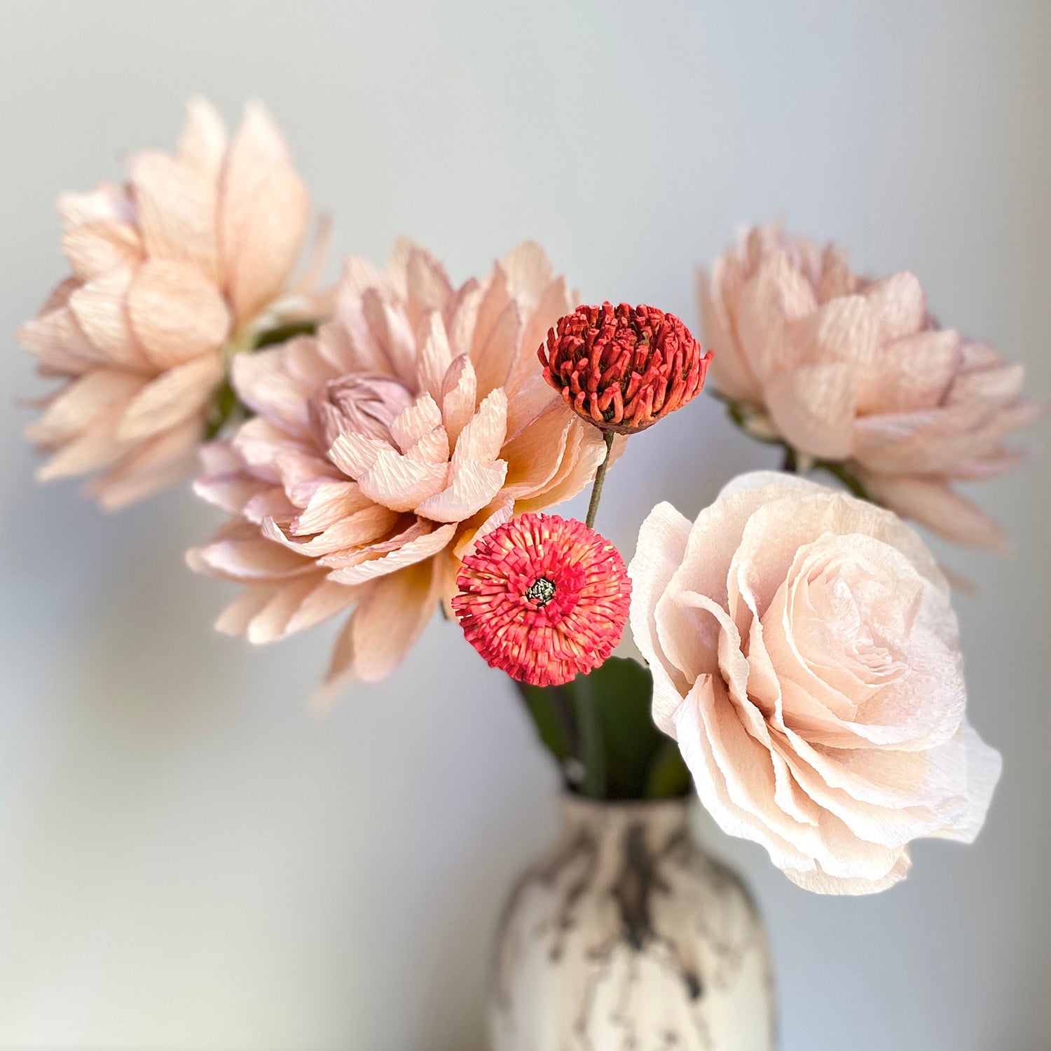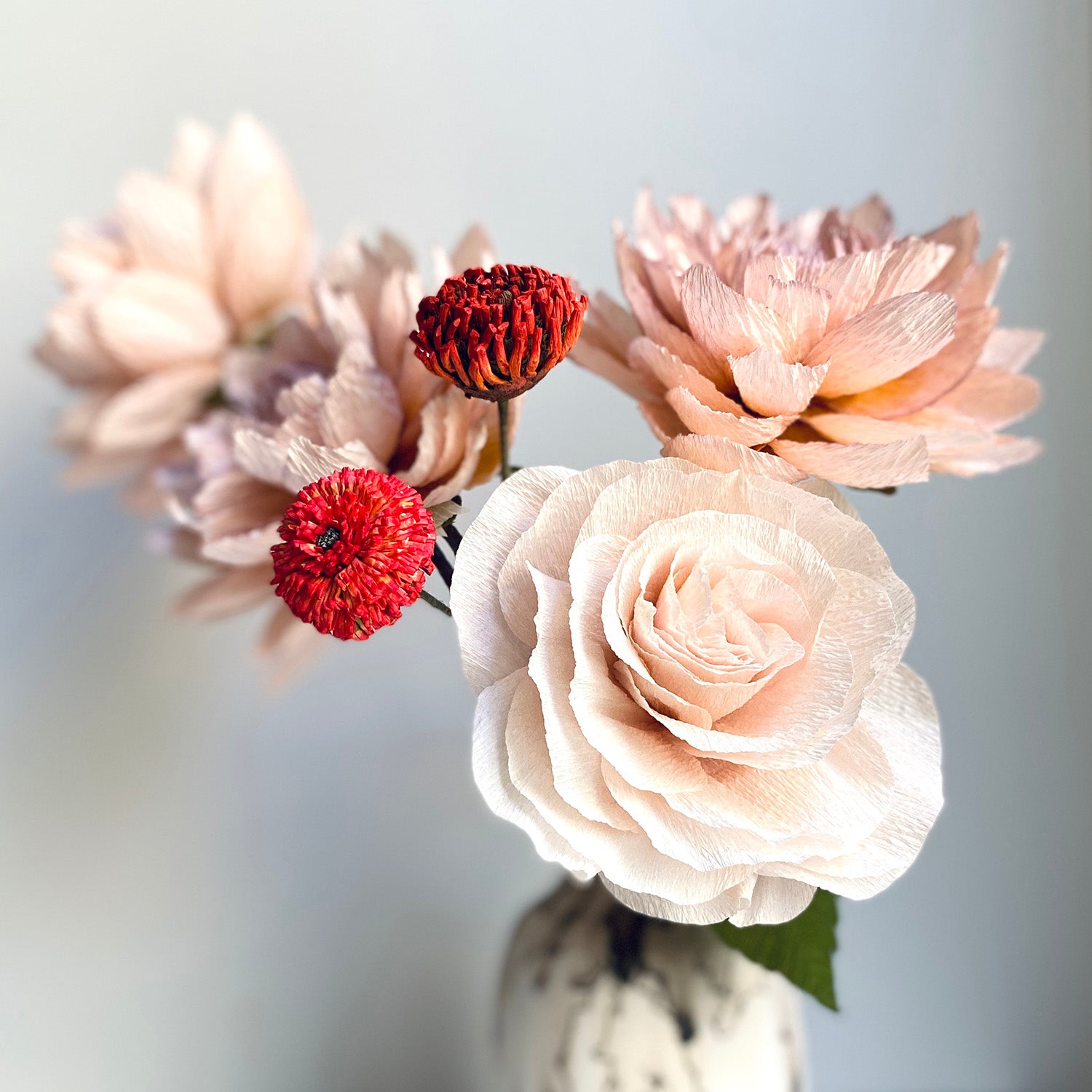 The Bayfield Arrangement is handcrafted from Italian crepe paper and coloured with various techniques to achieve lifelike qualities.