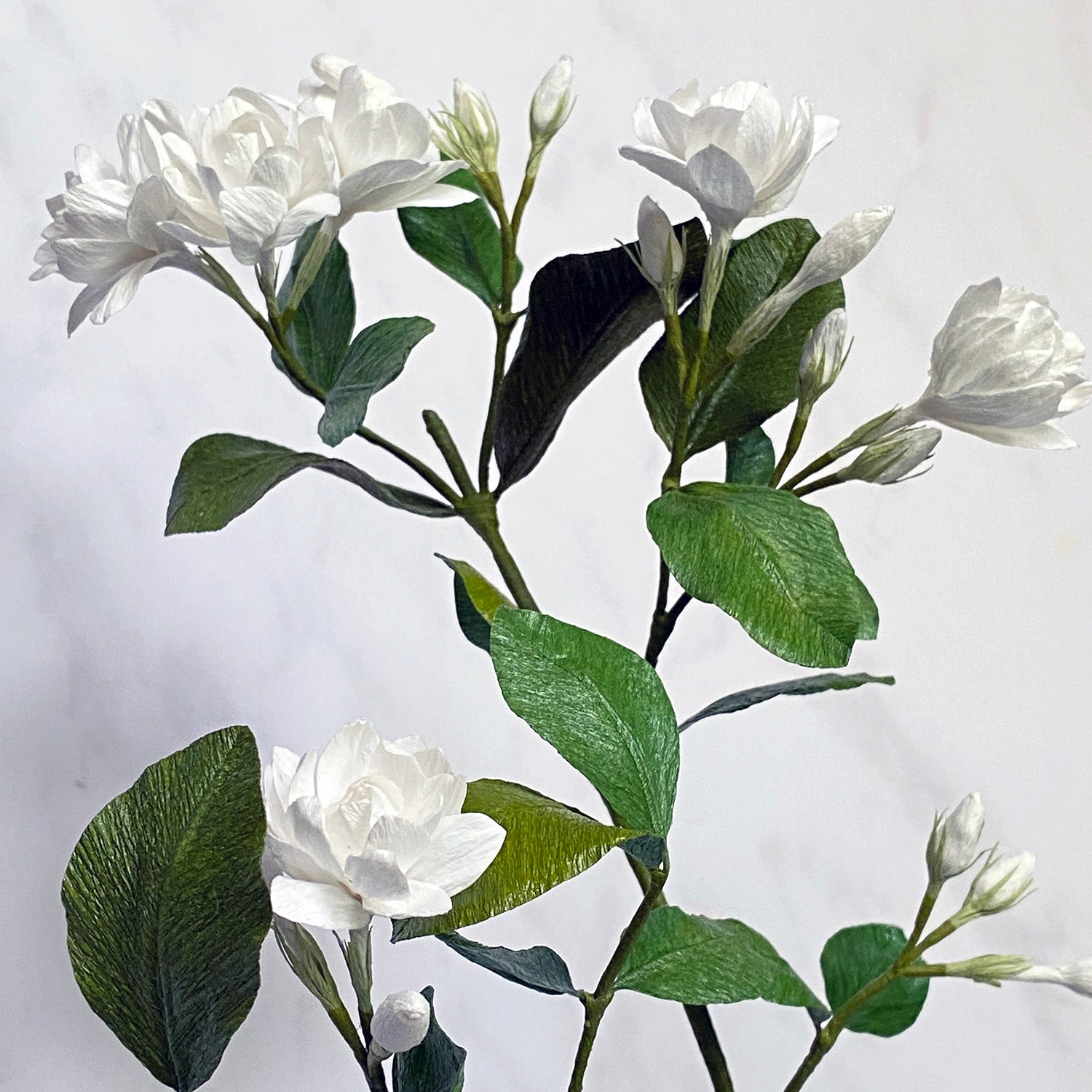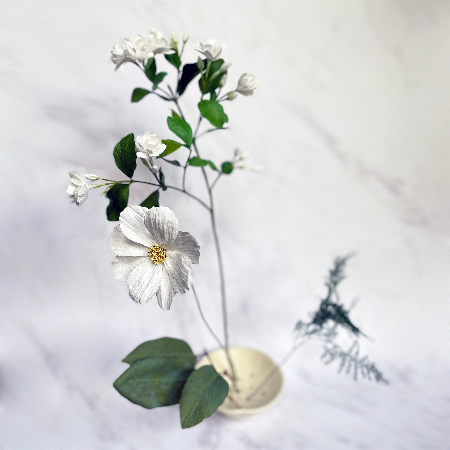 The Osaka arrangement features a branch of Jasmine Sambac, Cosmos Purity, Magnolia leaves and a sprig of preserved fern. The composition is light and fresh.